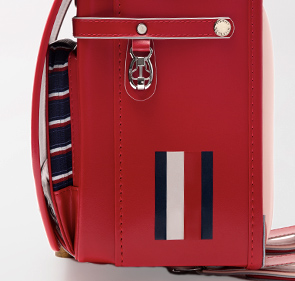 ランドセルのかぶせが登下校中に開かないよう、錠前を合わせると自動で鍵がかかる「ワンタッチロック式」を採用しました。また、持ち手やベルトの縁には、車のライトなどに反射するリフレクターを装備。ランドセルカバーを付けても隠れにくく、雨の日の登下校の安全性を高めます。ベルトには防犯ブザーを付けるのに便利なDカンも装備。オリジナルデザインの防犯ブザーと、巾着袋も付属しています。