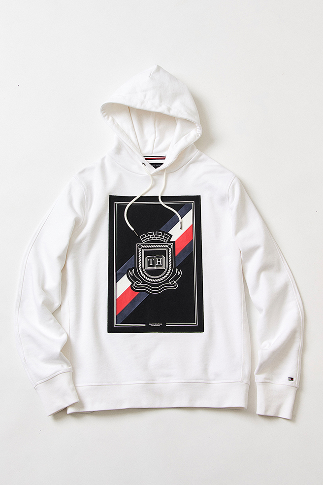 プレッピーテイストなクレストロゴがあしらわれたプルオーバーフーディ。厚すぎない快適な生地なので、さらりと軽快に着こなせます。