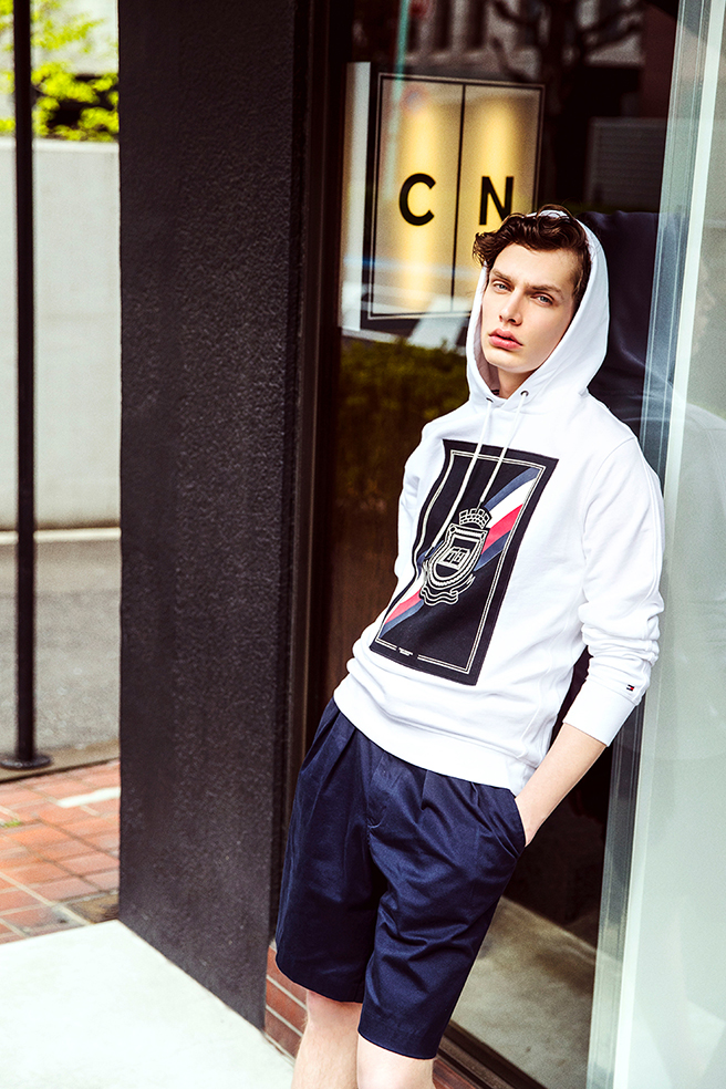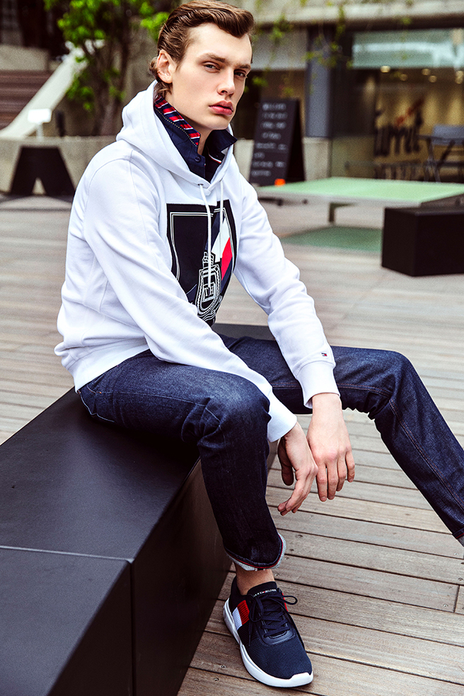 初秋らしいレイヤードを楽しむなら、ひと工夫を。フーディのプリントにあしらわれたグローバルストライプをリフレインします。襟裏にレジメンタルストライプ柄の入ったポロシャツと軽快なスニーカーを合わせて、はき慣れたリジッドデニムでまとめれば、スタイリッシュさがアップ。