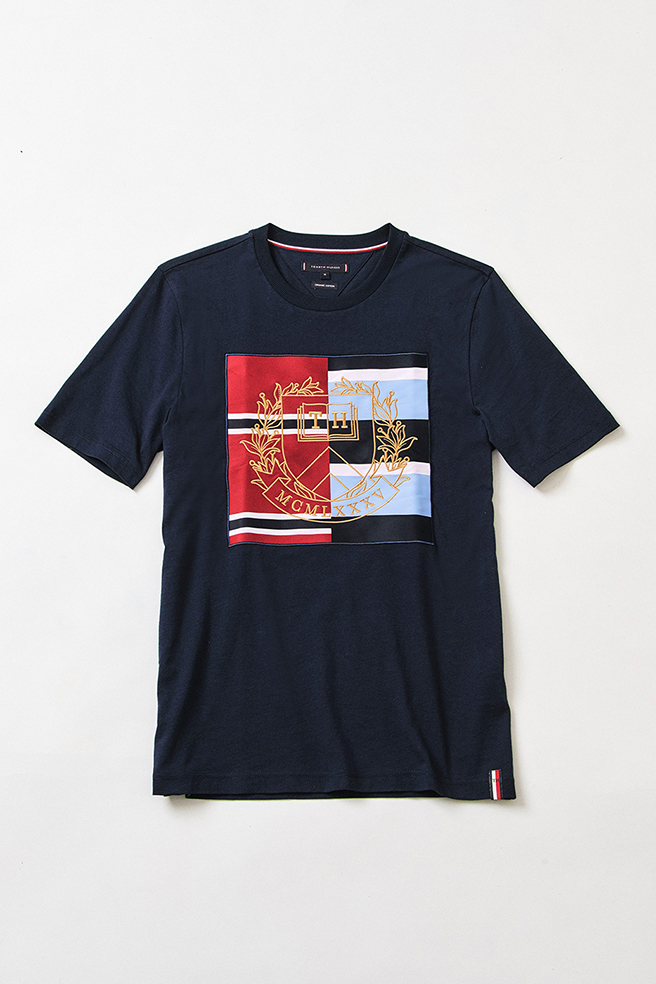 刺繍のクレストとパッチワークをミックスしたプリントに遊び心が感じられるクルーネックT。ラフに着こなせるリラックスフィットが心地良い。