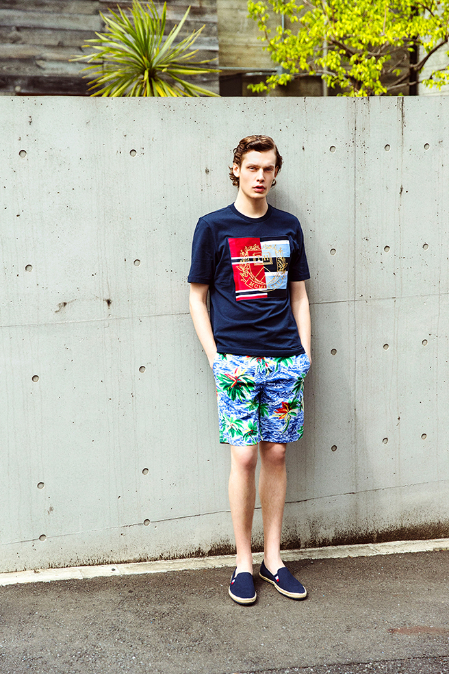 夏らしさを最大限に引き上げるなら、クレストと調和する色みのハワイアンショーツが最適。ともにキャラクターの強いアイテムをあえてミックスすることで、強い存在感を醸し出します。キャンバスのエスパドリーユで季節感も増幅。
