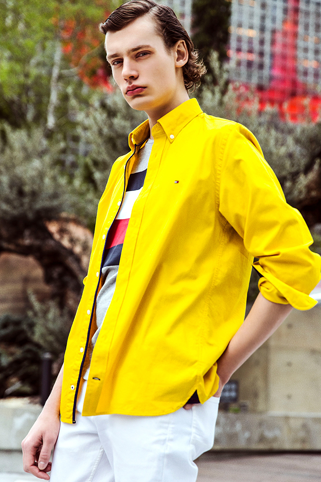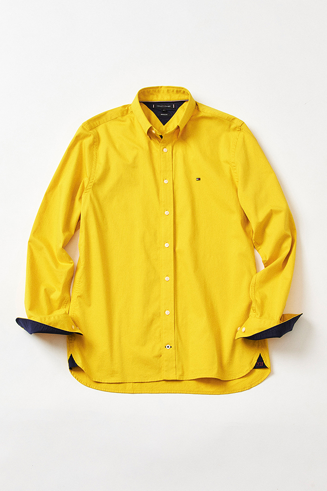 まばゆいイエローのボタンダウンシャツは、着回しやすいレギュラーフィット。袖裏にネイビーの素材を当てており、ターンナップすれば表情も変化。トップボタンと二番目の間隔が狭いため、ボタン一つ開けでもだらしなく見えません。