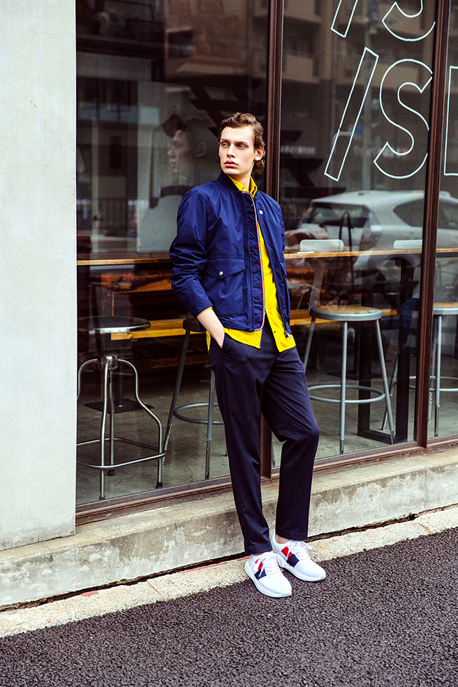 インナーでの“差し色”使いにうってつけのイエローシャツ。シックさが際立つネイビーワントーンの上下に一点投入するだけで、互いを引き立て合うこと必至です。ブルゾンの色みをスニーカーで拾って、着こなし全体を単調に見せない小技もチラリ。