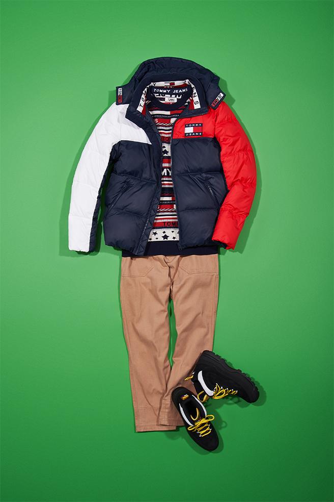 左右非対称なカラーリングが印象的なパッファは、インナーに柄物ニットを合わせ、90’sらしく色×柄で遊ぶのがおすすめ。チノライクなワークパンツとハイカットのスニーカーを合わせれば、カルチャー感のあるストリートスタイルに。
