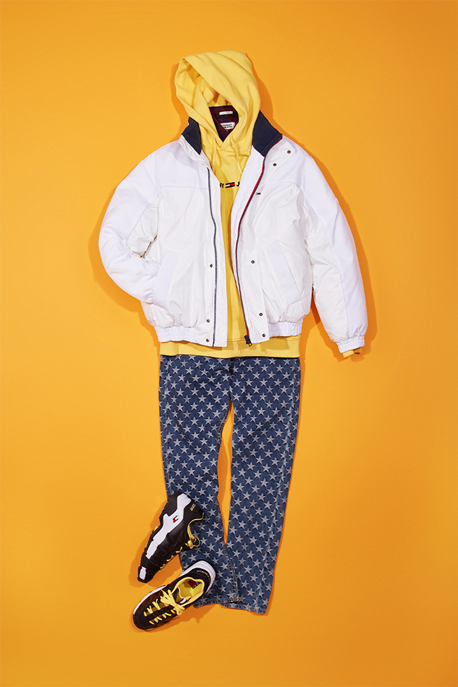 ビッグサイズのホワイトパッファにあえてオーバーサイズのパーカーを合わせることで、90’sストリートを感じさせるボリューム感に。デニムのスター柄とイエローを効かせた遊び心たっぷりのスタイル。
