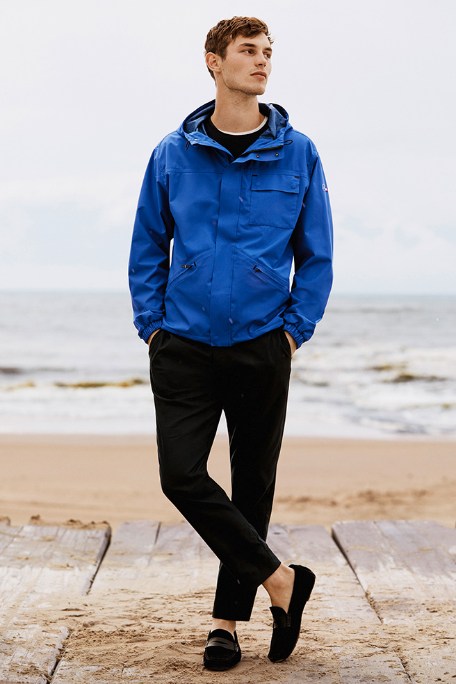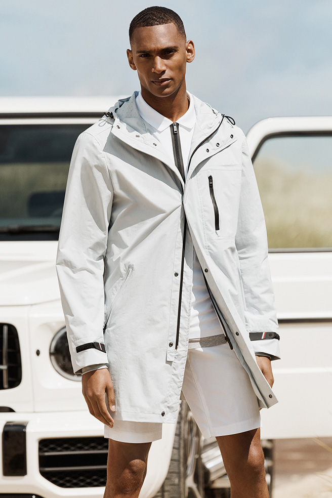 マットな質感のテクニカルファブリックを使用したパーカは、軽快なライトグレーがこれからの季節にベストマッチ。フロントにはスナップボタンに加え、素材の強度を保つよう熱融着させた止水ジッパーを採用。ブラックカラーもポイントとなり、袖口のカフスディテールも含めて絶妙なアクセントをプラスしてくれます。ゴム引きのジップをあしらったジャージー素材のポロシャツとストレッチ性のあるショーツをホワイトでまとめれば、クリーンでスポーティーな都会的スタイルの完成です。