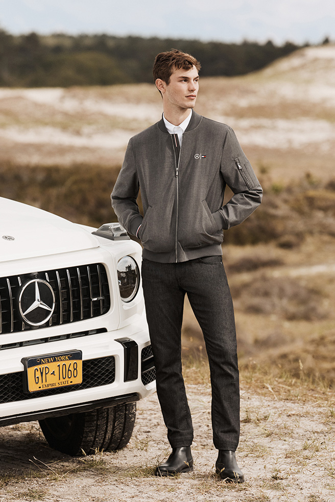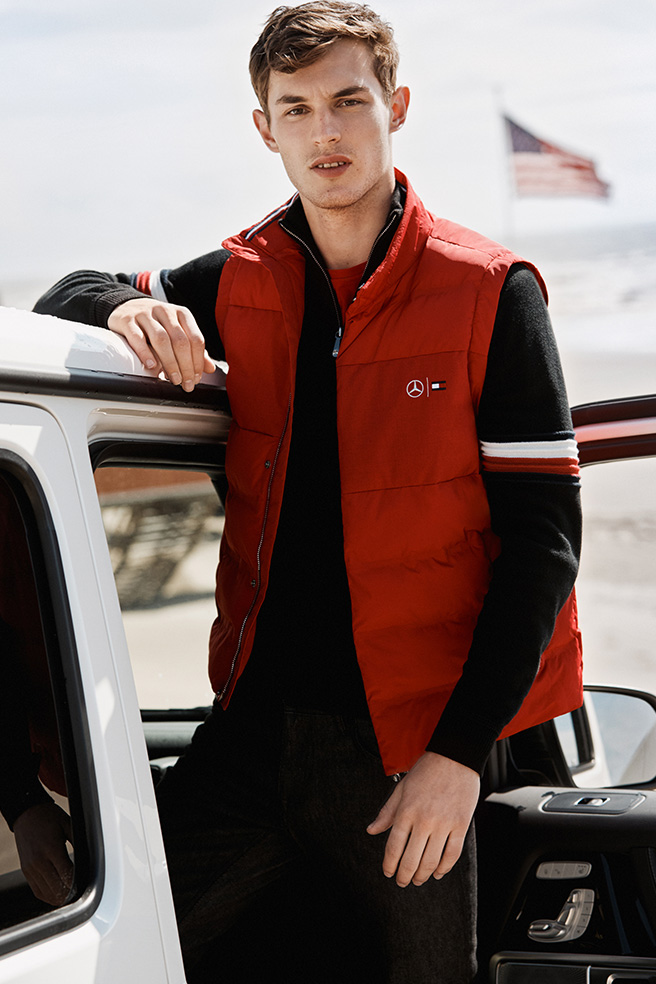 軽量で保温性や通気性に優れたThermore®社の中綿を使用したキルティングベストは、季節の変わり目に重宝するだけでなく、レイヤードスタイルも楽しめる一着。胸元にあしらったトミー ヒルフィガーのフラッグとメルセデス・ベンツのTriStarがさりげなく映え、所有欲を高めてくれる意匠にもなっています。レイヤードしたニットは、袖のトミー ヒルフィガーのシグネチャーストライプが効果的。カラーコントラストでベストを引き立て、奥行きのあるスタイリングを後押ししています。