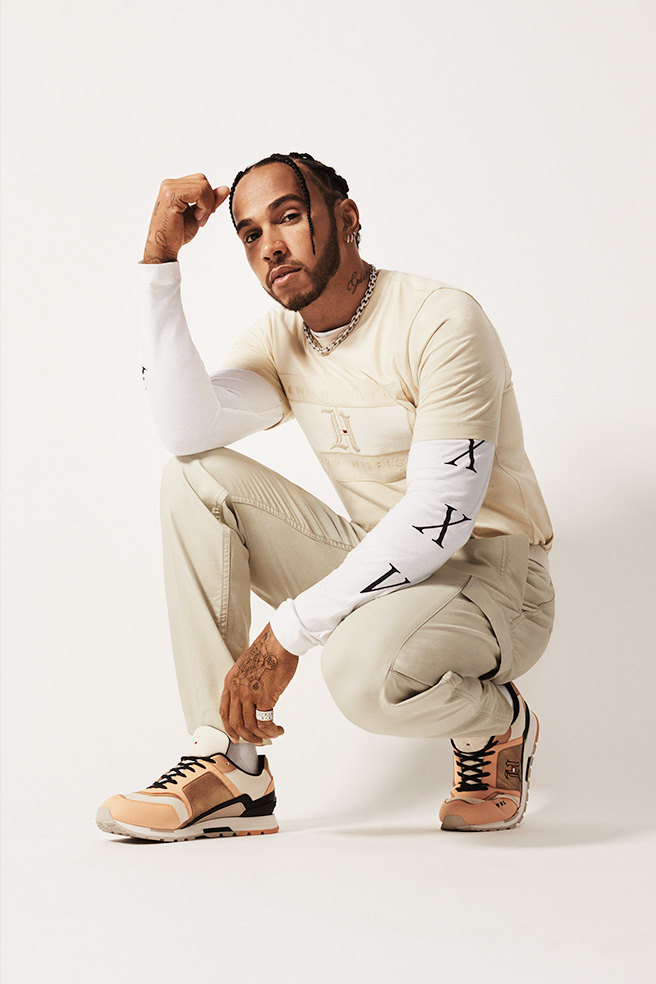 今季のルイス・ハミルトンとのカプセルコレクションで、テーマのひとつに挙げられる「TONALITY」。中間色を示すように、ベージュを用いたコーディネートがポイントです。重ね着したインナーには袖にルイス定番のロゴをあしらったカットソーをチョイス。ベージュトーンの中でさりげなく主張してくれます。ストリート感が溢れるなか、クリーンで洗練された印象の着こなしが完成。