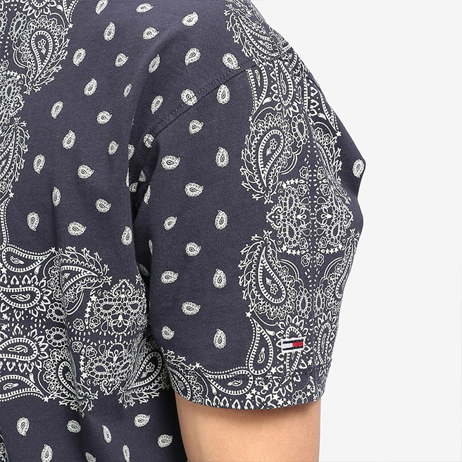 全面にバンダナプリントを施した総柄Tシャツ。繊細なタッチで描かれたペイズリー柄が華やかな印象で、ボディから浮き立つような立体感を演出。さらにパッチワーク風のパターンは、大振りのチェック柄のような表情をもたらし、遠目からでは異なる雰囲気を与えてくれます。左袖にはフラッグロゴをあしらい、さりげないアクセントをプラスしました。