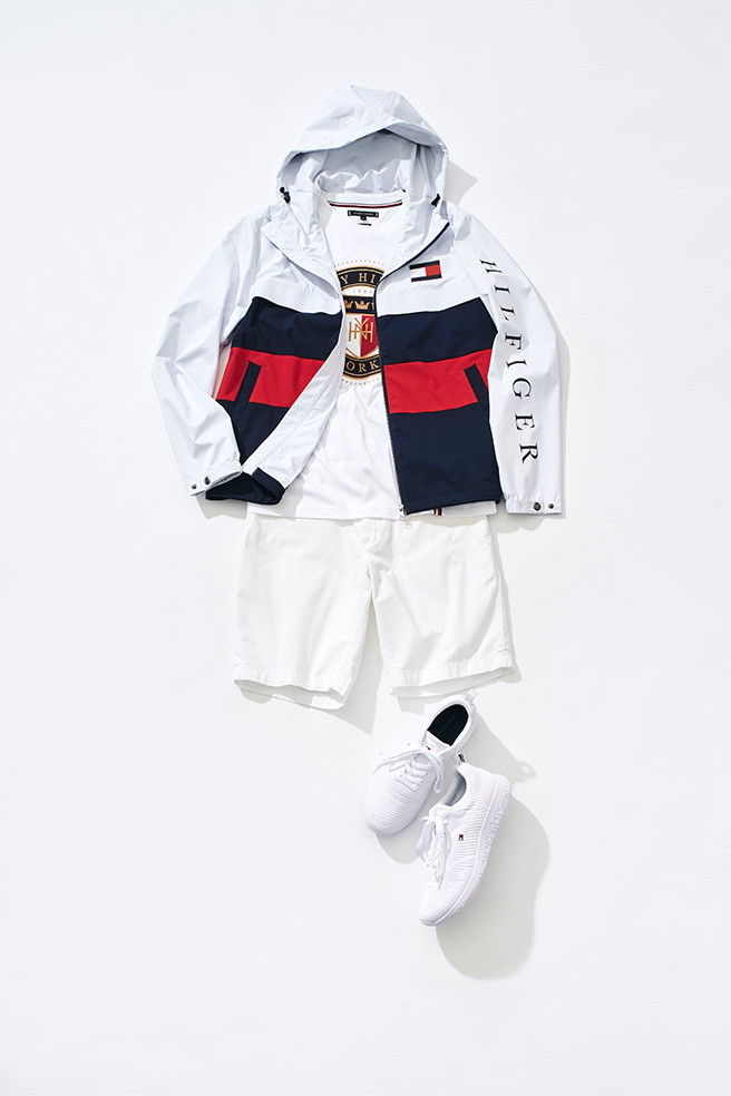 ホワイト×レッド×ブラックで構成した薄手のフード付きブルゾンを軸に、カットソーやショーツ、スニーカーの他アイテムは白で統一。トレンドのスポーティーコーデを表現しつつ、上品さや清潔感といった大人の雰囲気を意識しました。カットソーに施されたシールドロゴ刺繍もポイントで、ゴージャスな印象をプラス。ブルゾンは撥水加工やストレッチ性を備えているため、幅広いシーンで活躍してくれます。