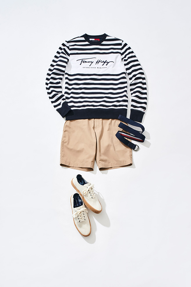 シグネチャーのブランドロゴを配したボーダー柄のスウェットは、取り入れやすいアイテムでありながら、さらりと着るだけで存在感を主張してくれます。ベージュのショーツと合わせれば、アメリカンカジュアルを彷彿とさせるコーディネートが完成。ショーツとスニーカーのジュートソールの色をリンクさせているのもまとまりのある雰囲気を演出するテクニック。都会の街並みはもちろん、海辺などリゾートシーンにも似合う着こなしです。