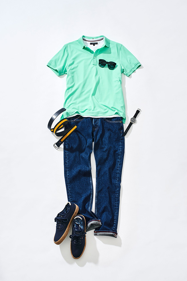 デニムスタイルに夏らしい季節感をプラスするなら、明るめカラーのポロシャツがオススメ。アイテム自体は派手に見えても、ボトムスが万能戦士のデニムとなればコーディネートも簡単。すんなり合わせられるうえに、爽やかな大人のカジュアルスタイルが手に入ります。さらにポロシャツのインナーに白Tシャツを投入するのも効果的。裾から覗く面積が奥行きをもたらし、こなれた雰囲気を上乗せしてくれます。