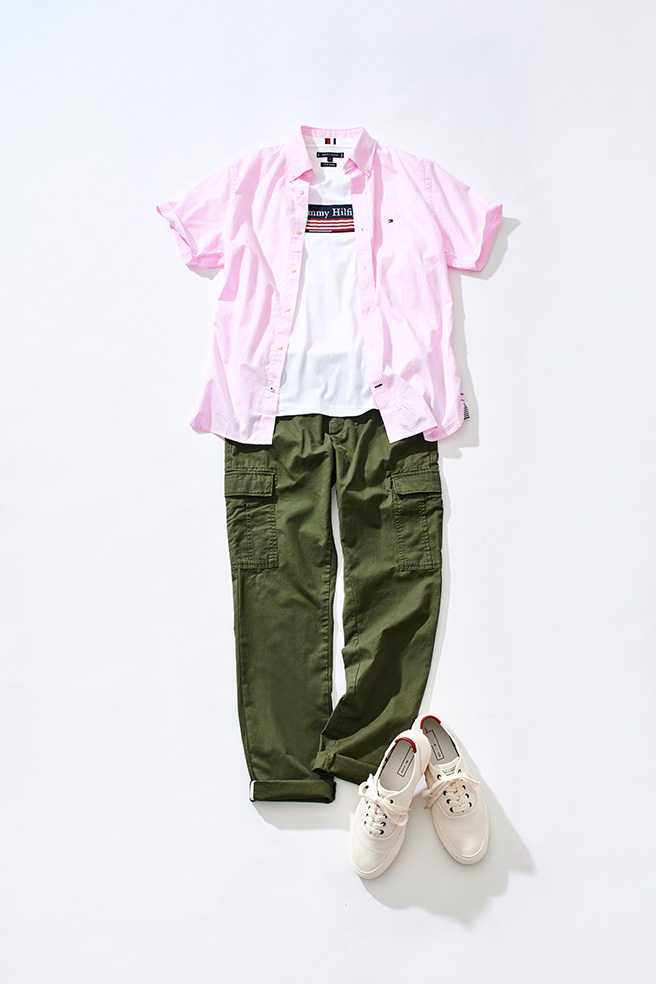 Tシャツ+パンツの定番スタイルに、ピンクのシャツを一枚投入すれば、爽やかな雰囲気が一気にプラスされます。ここでポイントとなるのがパンツのカラー。カーキのように落ち着いた色と合わせることで全体がグッと引き締まり、トップスを引き立てる効果も期待できます。インナーのTシャツとスニーカーに白をチョイスすれば、清潔感も漂うスタイリングの完成です。