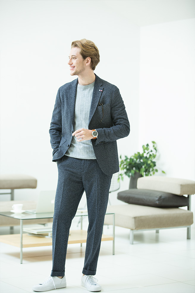 スリムフィットのシルエットに加え、メランジのような表情が都会的な印象を漂わせるセットアップ。ジャケットはアンコン仕立てで軽く、柔らかな素材が快適な着心地を与えてくれます。さらにシワにもなりにくく、付属のバッグにパッカブルとして持ち運べば出張や旅行にも重宝確定。パンツはウエストの後ろのみゴムを装備させたプルオンタイプで、常にリラックスしたはき心地。前からの見た目はきちんと感があり、トレンドのベルトレススタイルも容易に叶います。ジャガード織りでヘリンボーンを表現したニットや、ベルトがブラウンの腕時計を合わせれば、秋らしさを感じさせる着こなしに。ジャケットの胸元に施されたシグネチャーカラーのラペルピンもさりげないポイントになり、リモートワーク中もスタイリッシュな印象を演出してくれます。