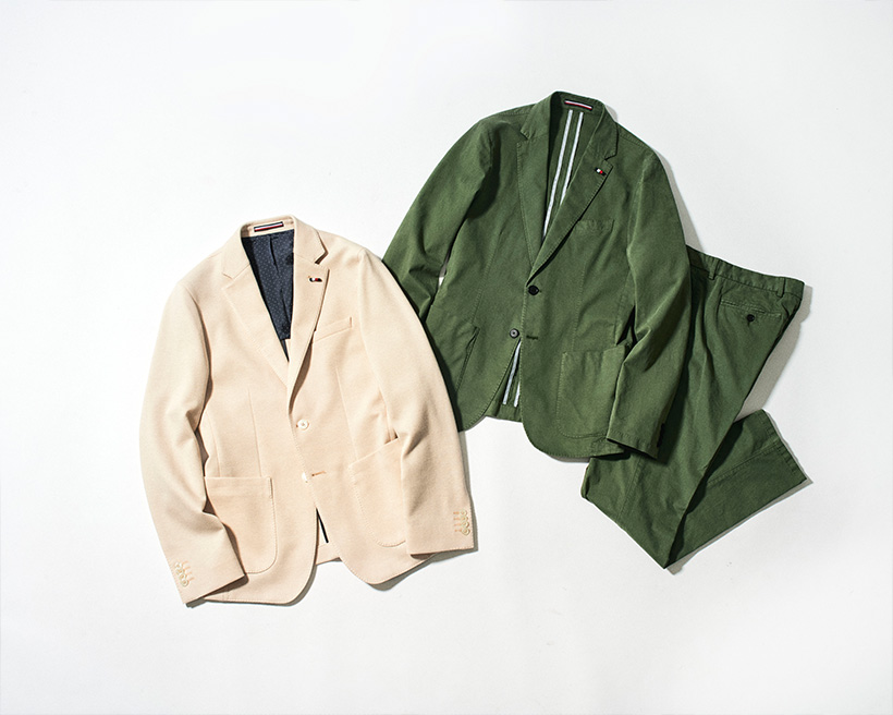【右】今季のトレンドカラーに挙げられているアースカラーを用いたスリムフィットのセットアップ。ジャケット、パンツそれぞれ単体で使え、合わせるアイテムによって幅広いコーディネートを叶えてくれます。コットンをブレンドした素材は柔らかく、ストレッチ性も備えるため着心地はいつでもノンストレス。