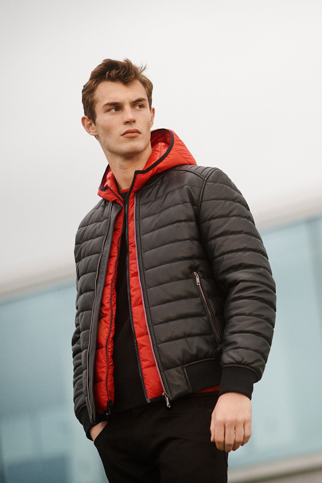 上質なレザーによる光沢感が美しいボンバージャケットは、細ピッチのキルティングやショルダーの切り替えがスポーティーな雰囲気を漂わせます。黒でまとめたインナーとボトムスに、明るいトーンのベストをレイヤード。カラーコントラストによる視覚的な奥行き感も相まって、ボンバージャケットが最大限に際立つコーディネートが仕上がります。ベストは軽量で暖かく、リバーシブルなので使い勝手も抜群。トミー ヒルフィガーのフラッグとメルセデス・ベンツのTriStarをあしらったスペシャルな胸元がひと目を引くこと間違いなしです。