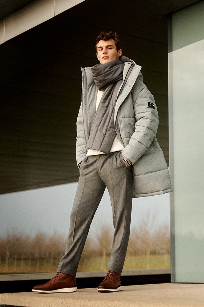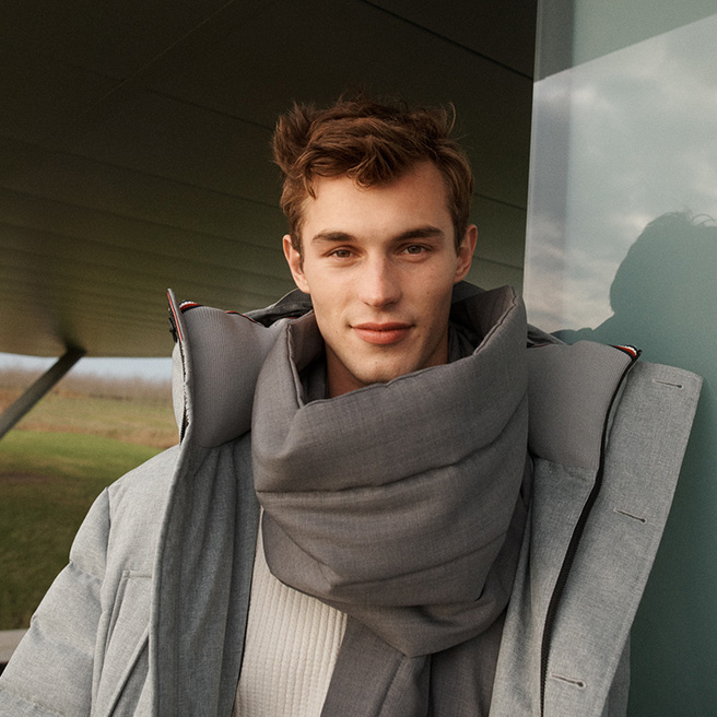 ジャケットには、オリジナルのTH FLEXを使用し、今風のスタイルと極上の着心地を両立させました。キルティングのステッチワークも、スタイリングに立体感を与えてくれます。インナーにメランジ調のロールネックニットを合わせることで、首元や袖口に配したシグネチャーストライプがシックなトーンの中にさりげないアクセントと遊び心をプラスしてくれます。ジャケットのフードは取り外しができ、コーディネートに合わせてすっきりとした首回りを演出することも可能。