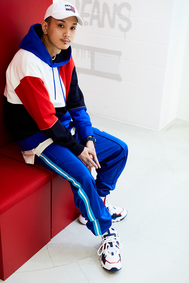 プルオーバーパーカーは異なる面積のカラーブロックを用いたテクニカルなデザインが特徴。左袖にあしらったフラッグや切り替え部分に施したホワイトステッチなど、細部にまでこだわりが冴え渡ります。コーディネートもセットアップ風に全身のトーンを統一。ラインパンツとスニーカーを合わせて、90’sのストリートスタイルをイメージしました。