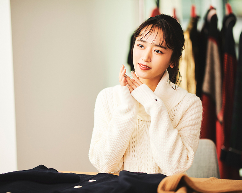 「私自身、昔よりもカジュアルなアイテムがすごく好きになったこともありますが、今回着用したアイテムはどれも今の私にぴったりでした。もちろんカジュアルな雰囲気だけじゃなく、30代の私にハマるような大人っぽい要素もあったからだと思います。例えばベージュのニットはボルドーを使った配色が絶妙で、ミニスカートもレザー使いで大人顔の仕上がり。あとは幅広いアイテムに合わせられて、着こなしのテイストを変えられるのもお気に入りです」
