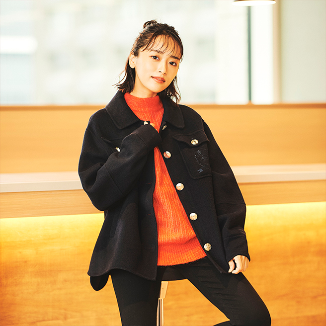 「このジャケットは大振りのボタンがプレッピーっぽくてすごくかわいいですよね。胸元にフラッグもあしらわれ、細かなディテールにこだわった一着です。またシャツのようにさらりと着られて、何にでも合わせられるのが魅力的。オレンジニットのような明るいインナーとのコーディネートでは、カラーコントラストによってジャケットとインナーの両方が引き立ってくれます。他にも同トーンのアイテムと合わせて大人っぽくシックに決めるのもオススメ。少しワイドシルエットでボリュームがあるので、細身パンツとの組み合わせによってメリハリが出て、スタイルアップできますね」