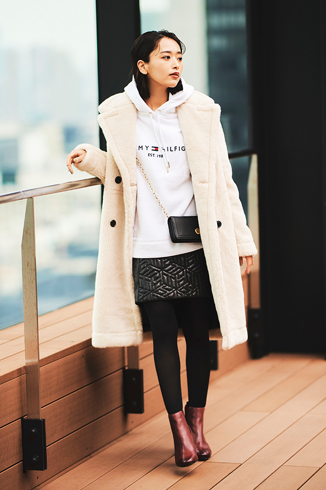 「ミニスカートは30代ともなれば緊張しがちなアイテムですが、シープレザーを使用したこのミニスカートは、大人っぽい仕上がりですんなり穿くことができます。フロントにモノグラムロゴがキルティングされていて遊び心もプラスされているのがいいですよね。しかもこのセンター部分に目を引くのでスタイルアップにも効果的。ふんわりとしたテディコートとフードパーカーを合わせれば、大人カジュアルなコーディネートに仕上がります。あとはタートルネックやロングブーツなどキレイめなアイテムともマッチするので、ディナーやデートシーンにも最適です」