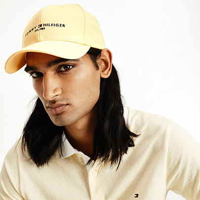 【右上】シーズナルカラーのひとつでもあるイエローを使用したキャップ。フロントパネルのロゴがストリート感を高めます。