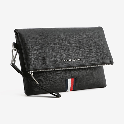 【右下】シボ感のある上品レザーを使用した大人顔のクラッチバッグ。メタルパーツのシグネチャーロゴやボトム部分のシグネチャーカラーもリッチさをプラス。