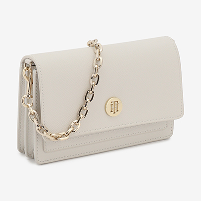 ホワイトの中でも純白のピュアホワイトは、気品がありフェミニンな雰囲気がたっぷり。立体的なシグネチャーロゴやゴールドのメタルパーツがさりげなく引き立ち、カジュアルやスポーティーなスタイルにもマッチします。一方、アイボリーは春映えする明るさに加え、落ち着いた印象も持ち合わせるカラー。ゴールドのロゴモチーフとチェーンストラップが程よく主張し、コーディネートにアクセントをプラスしてくれます。