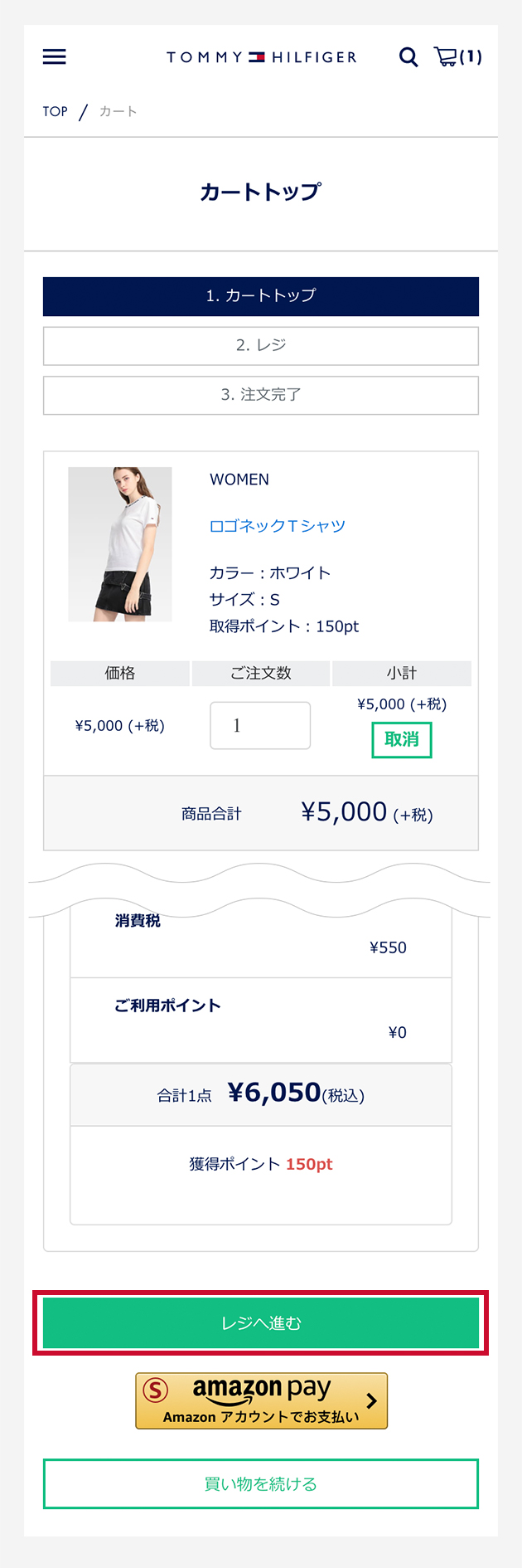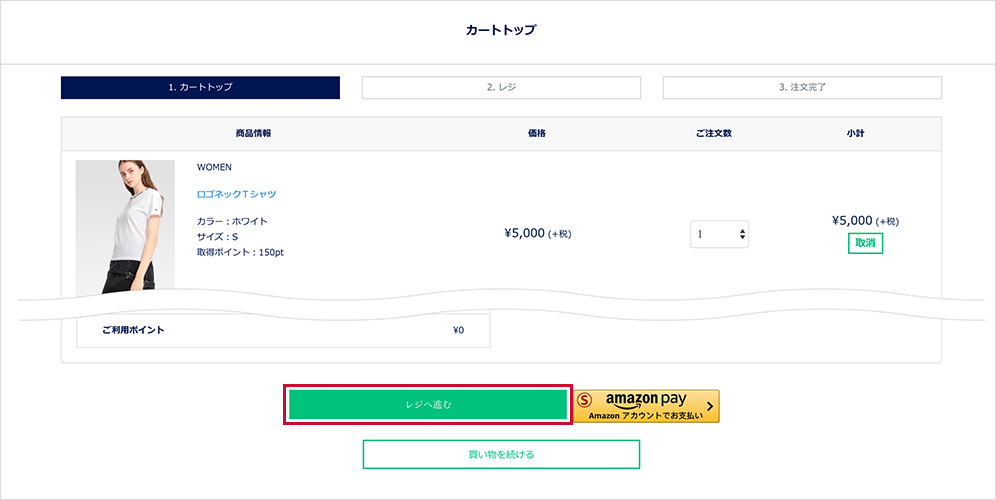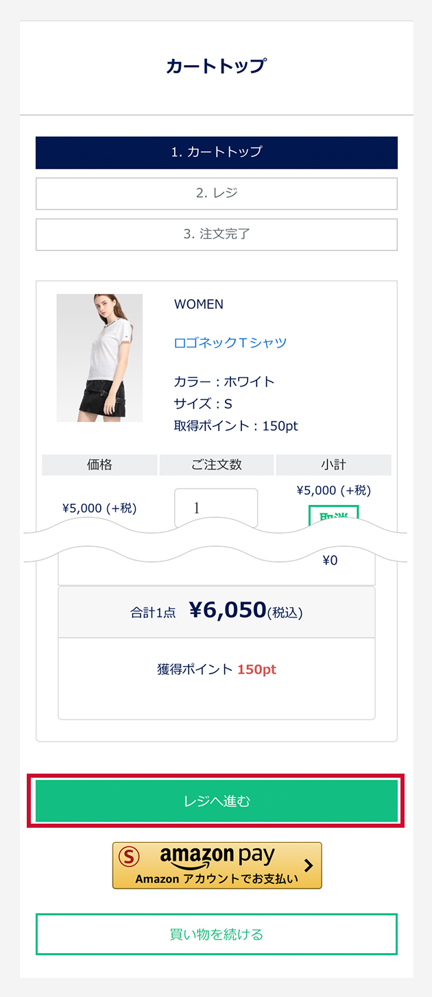 1.カートページにて注文内容を確認し、間違いなければ、「レジへ進む」ボタンをクリックタップしてください。
