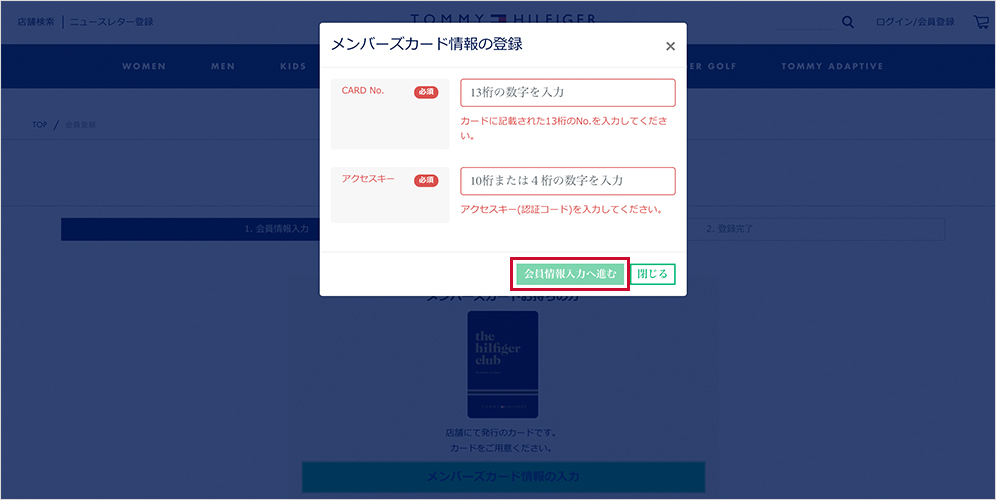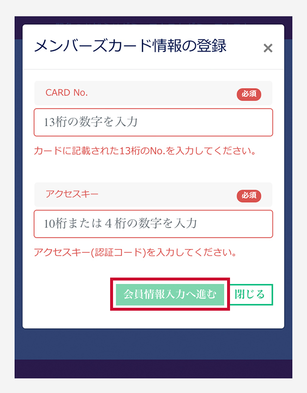 3.「CARD No.」と「アクセスキー」をご入力いただき、「会員情報入力へ進む」ボタンをクリックしてください。3.「メンバーズカード情報の入力」をタップしてください。