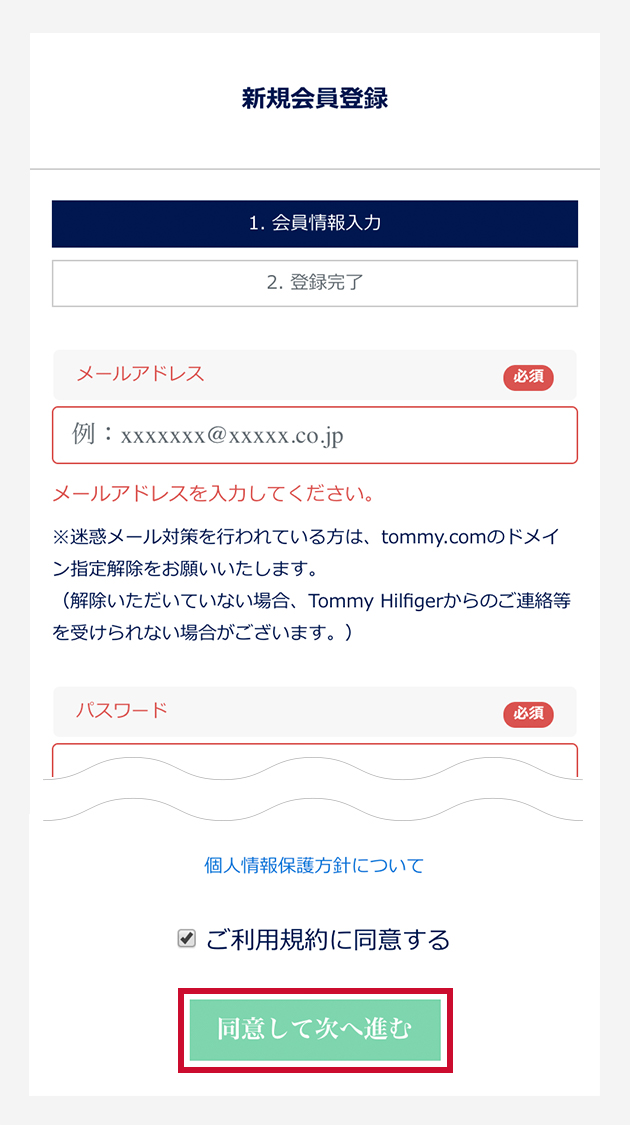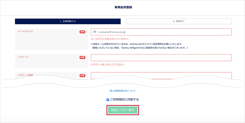4.ご利用規約を確認し、「ご利用規約に同意する」をチェックして「同意して次へ進む」をクリック。